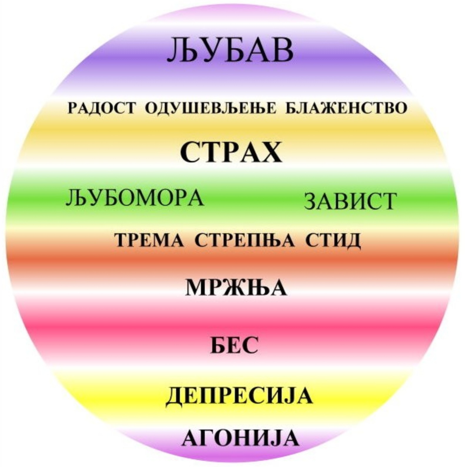 Изнад страха се налази љубав. Али љубав може бити помешана са страхом, па се показује као љубомора или као страст. И љубав се манифестује у облику спектра љубави. Радост, одушевљење и блаженство су њена лица. Љубав је увек стваралачки чин, док су сви деривати страха деструктивни процеси.